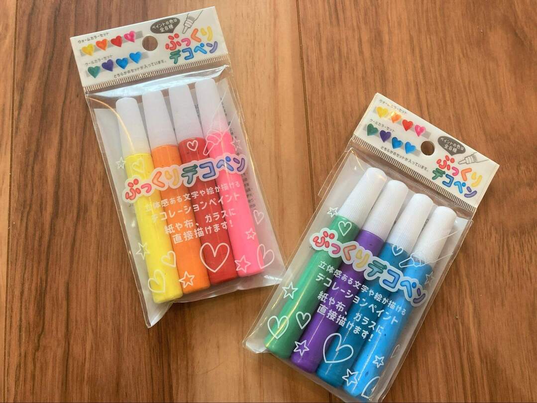 こちらがセリアで購入した「ぷっくりデコペン」です。1パッケージに4色入り全8色で、暖色系と寒色系の2種類あります。価格は1パック110円とコスパ抜群!