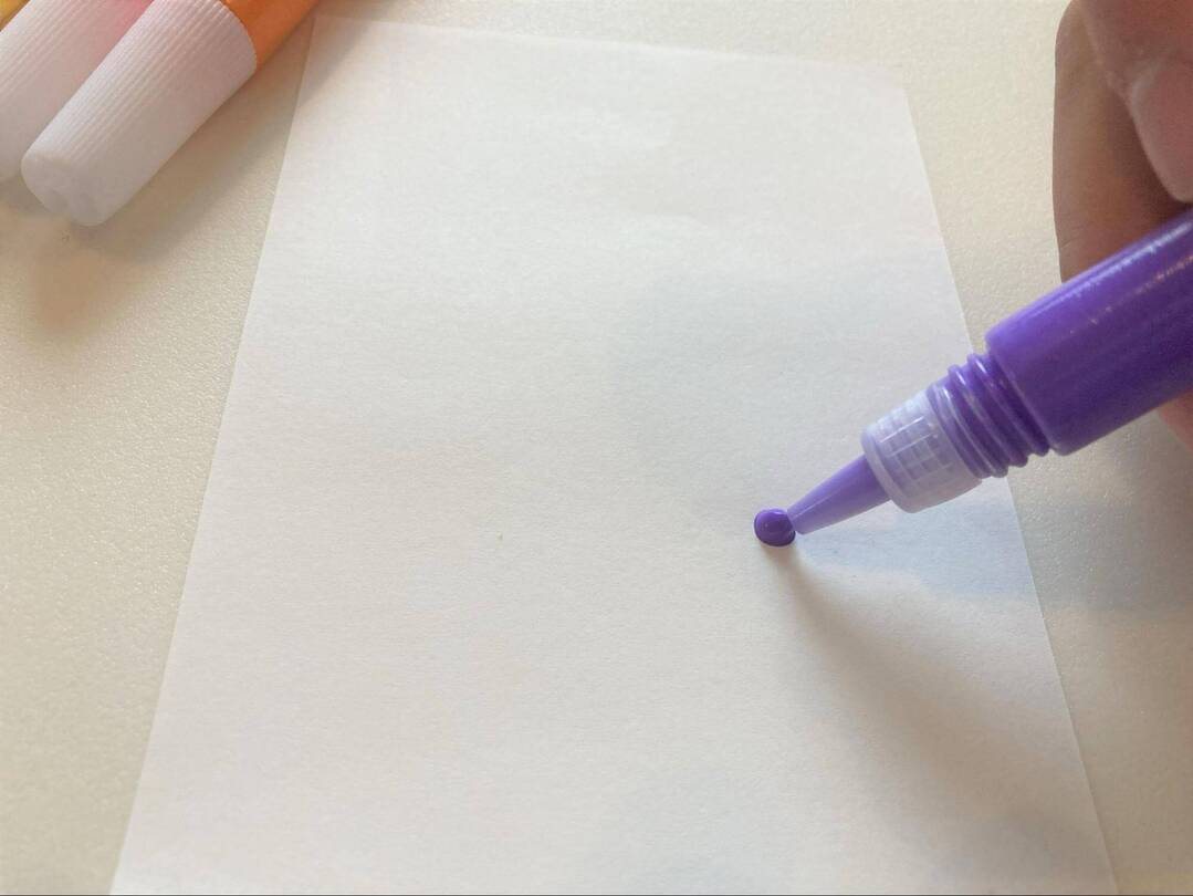 さっそく紙の上に出してみると、ペンというよりものりに近いテクスチャーで、「ラメ入りのり」のような感じ。