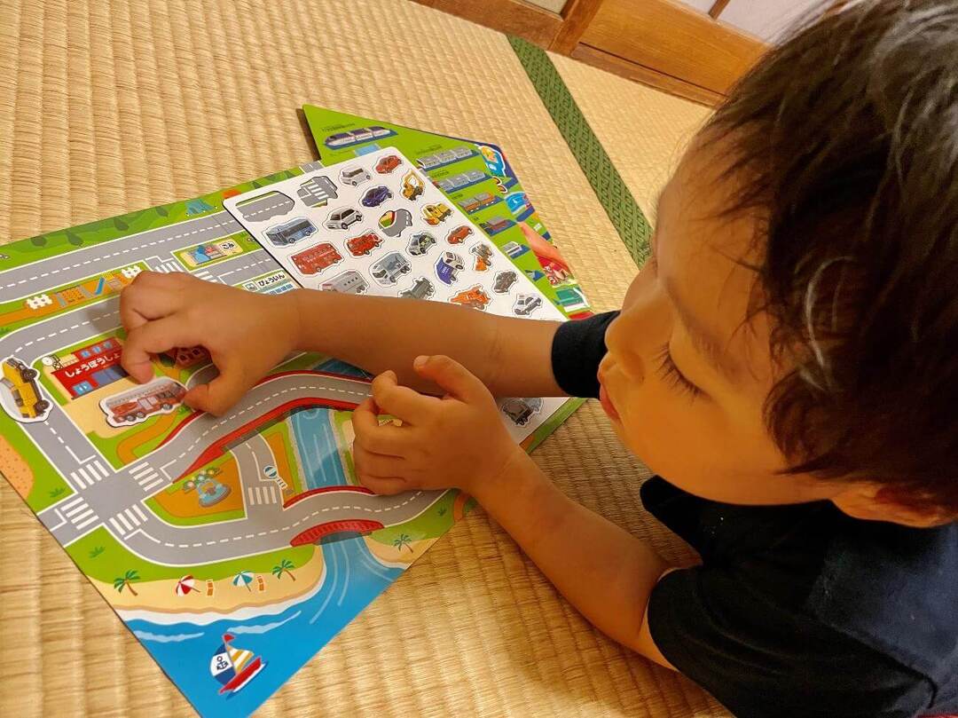 車や電車のマグネットシールは簡単に土台から外せます。プチプチ外したら準備完了!さあ、息子はどんなリアクションをするのでしょうか。