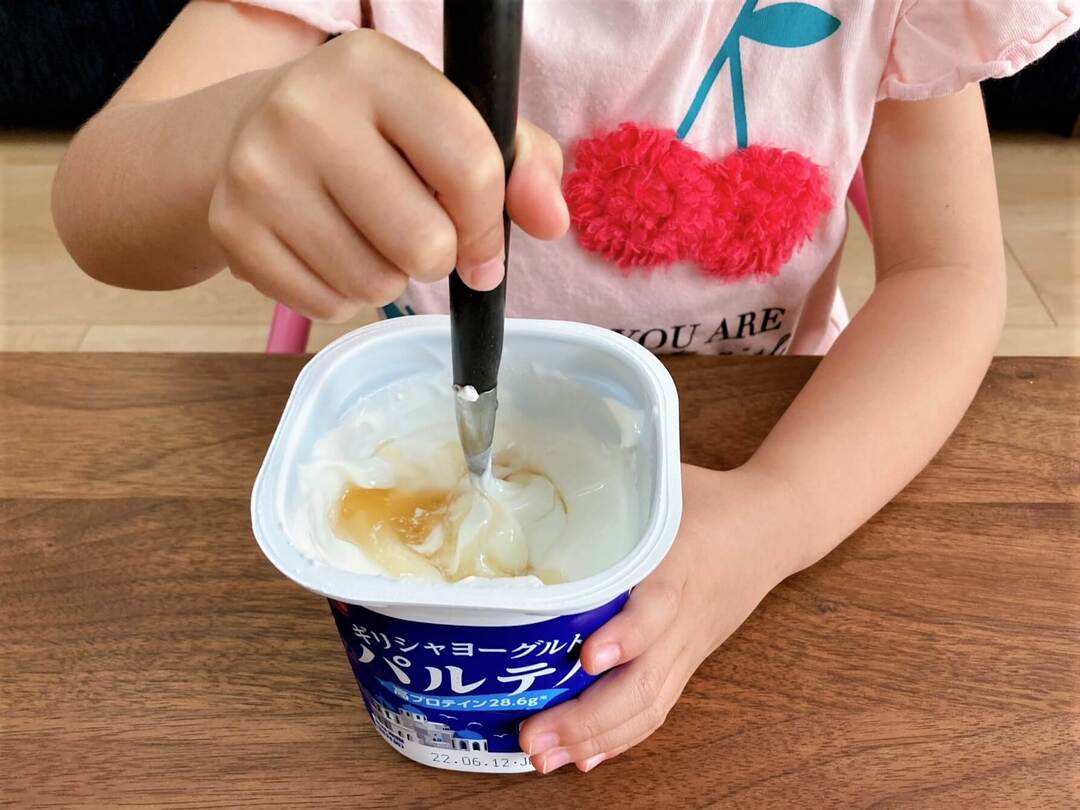 ヨーグルトの容器にはちみつを入れ、よく混ぜます。簡単な作業なので、子どもにお任せしてもいいですね。