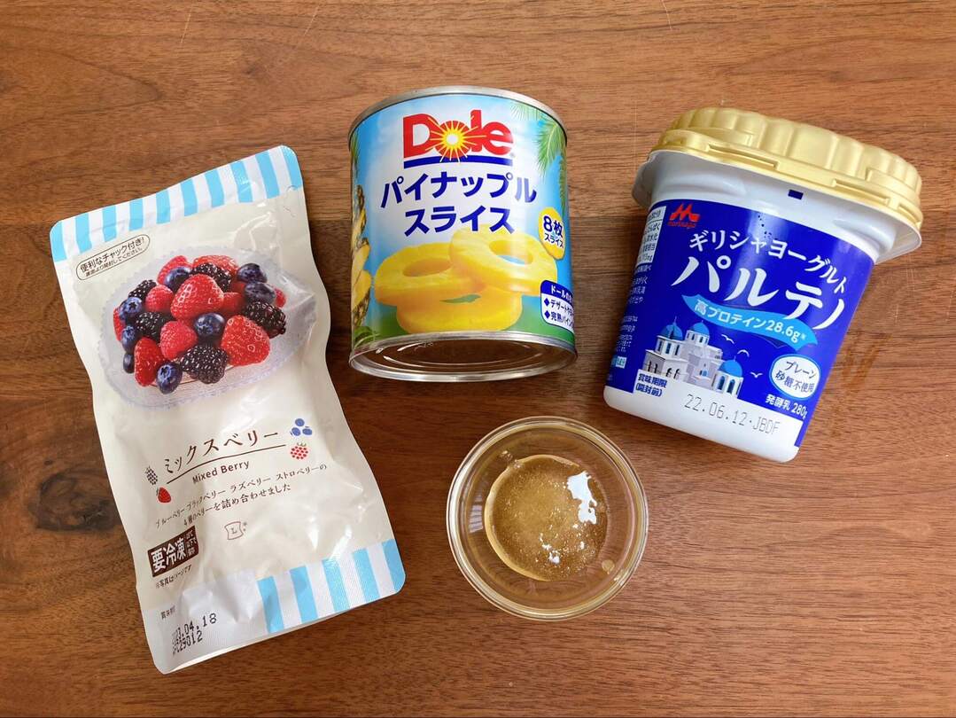 今回は水切りなしで簡単に作りたいため、濃縮ヨーグルトの「ギリシャヨーグルト パルテノ」を使います。もちろん、ふつうのヨーグルトを水切りして使ってもOKです。フルーツは好みのものを用意してくださいね!できあがりが華やかになるように色のバランスを考えるといいですよ。