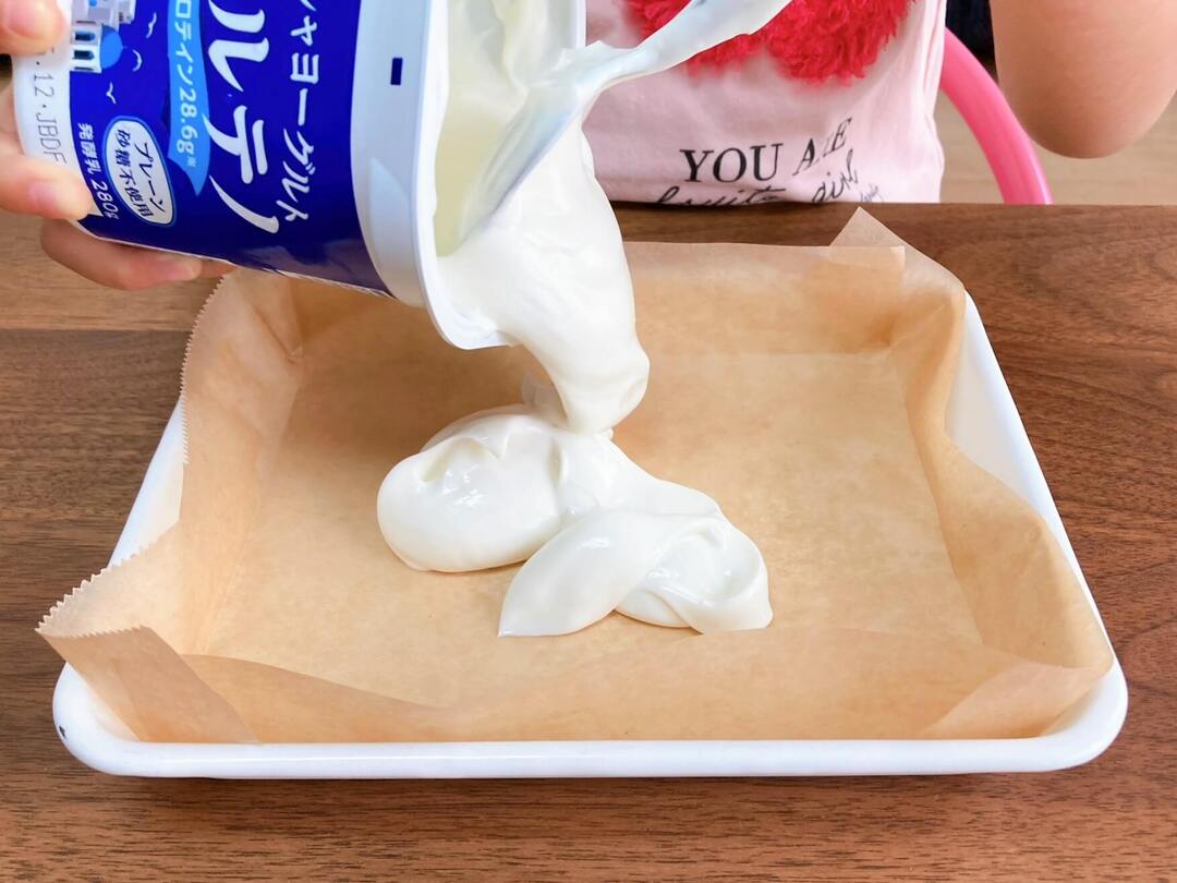 混ぜ終わったヨーグルトを、クッキングシートを敷いたバットに流しこみ平らにします。