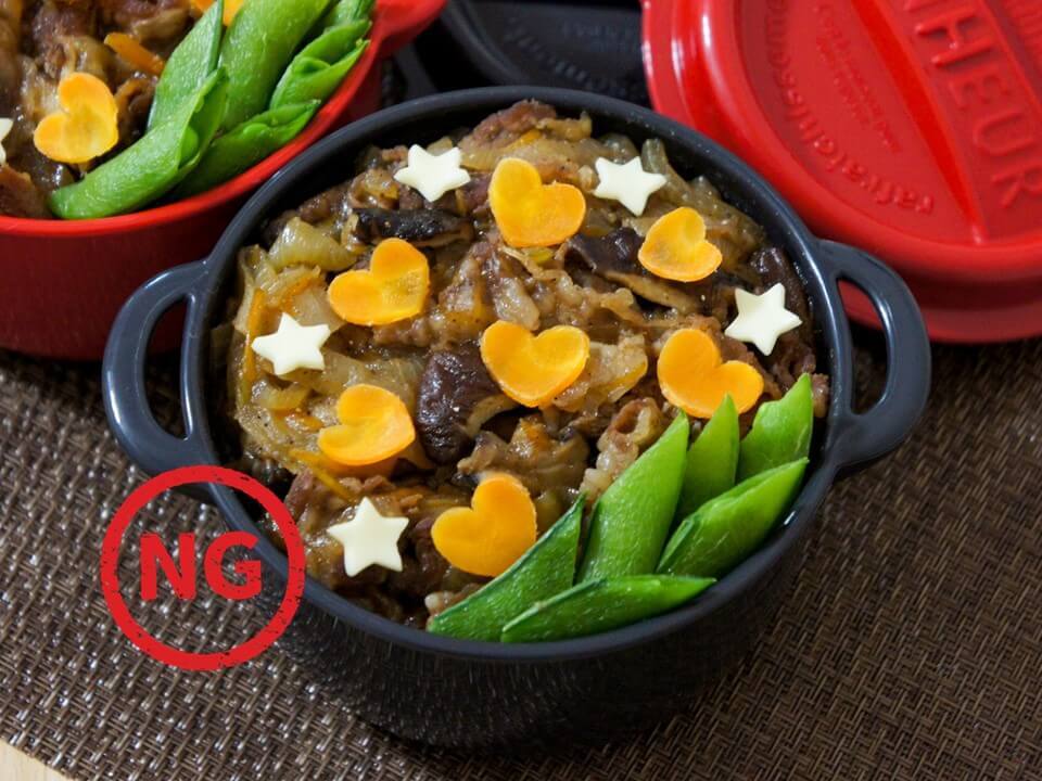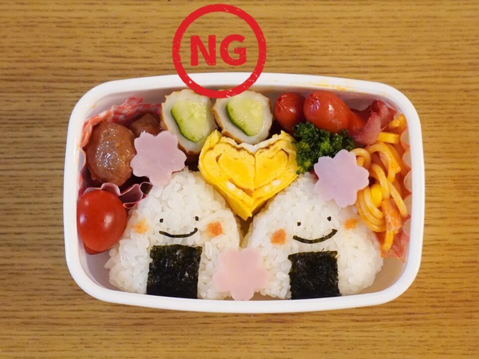ご飯の上におかずをのせたのっけ弁当やどんぶり弁当、仕切りをせずにおかず詰め込んだぎゅうぎゅう弁当も注意!