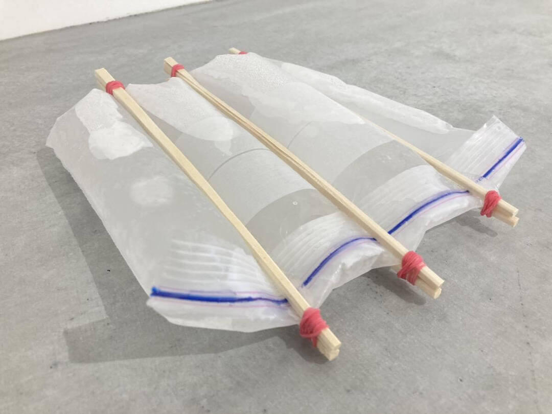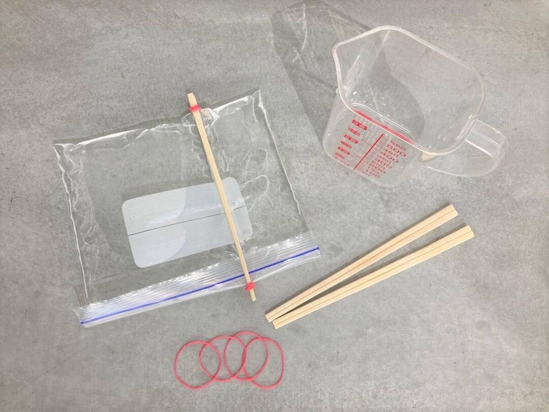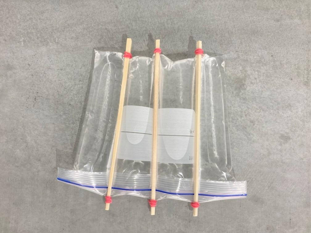 つぎにフリーザーバッグを平らな場所に寝かせ、パキッと割った1本の割りばしを作りたい太さに合わせて上下で挟みます。位置が決まったら割りばしの両端を輪ゴムで留めていきましょう。