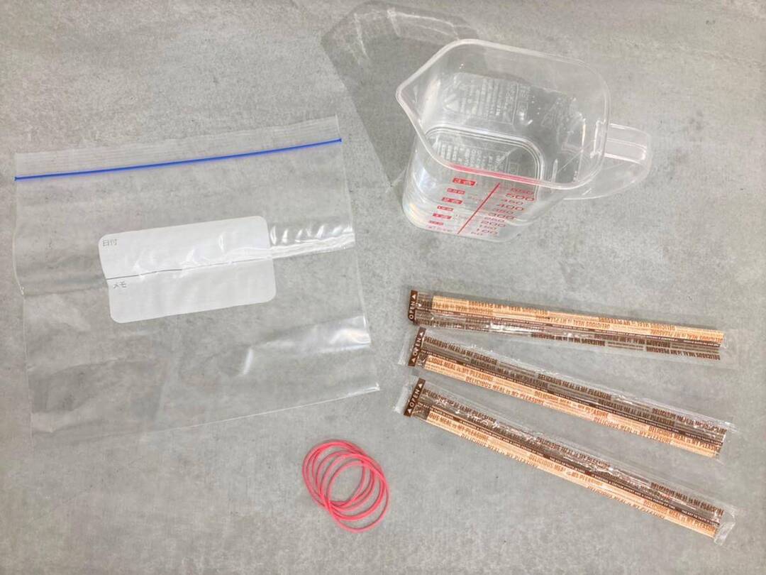 すべての割りばしを輪ゴムで留めました。今回は3か所挟み、合計4本の「細長い氷」を作っていきます。口が広めの水筒に入れる場合は割り箸で留める箇所を減らし、ペットボトルなどさらに口の狭い容器に入れたいなら増やしてください。