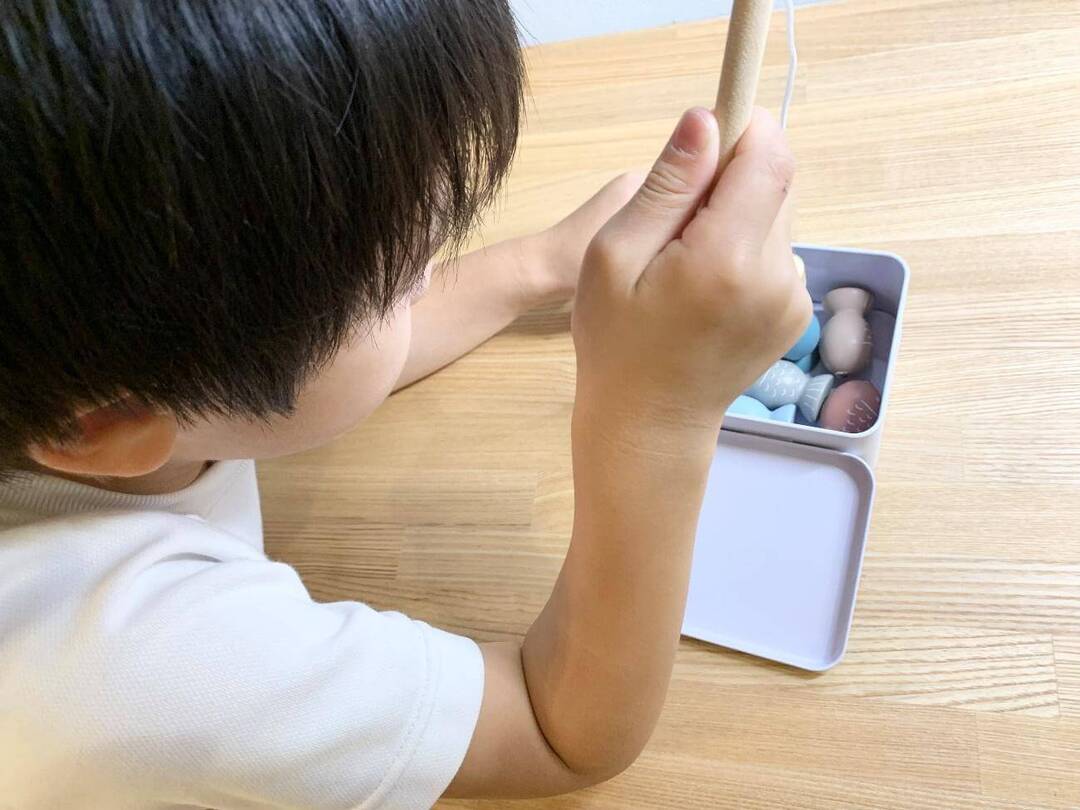 さっそくわが家の息子に遊んでもらいました。いつもは小学校から帰ったらゲームに夢中な息子ですが、シンプルな魚釣り玩具に予想外の食いつきっぷり!