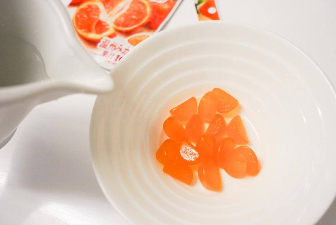 そんなときネットでいろいろな人が明治「果汁グミ」と水だけでゼリーを作っているのを発見!ゼラチン不要で、火も使わずにできちゃうんです!