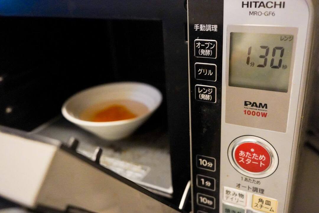 ラップをせずに、600wの電子レンジで1分30秒加熱します。
