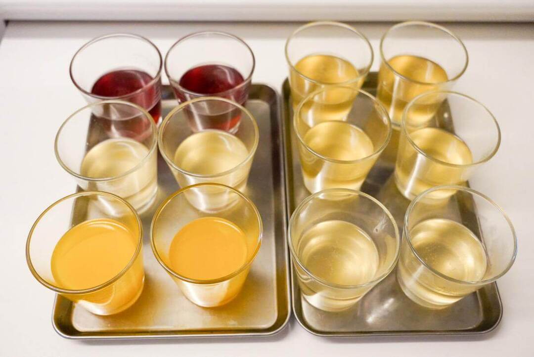 6種類の味の果汁グミゼリーを作りましたが、温州みかんとぶどう以外はりんごジュースのようなシャンパンゴールドカラーに。