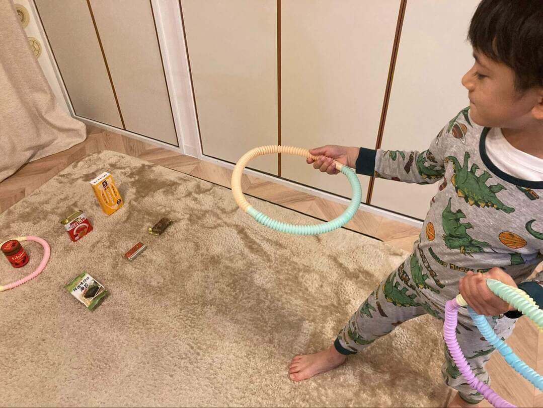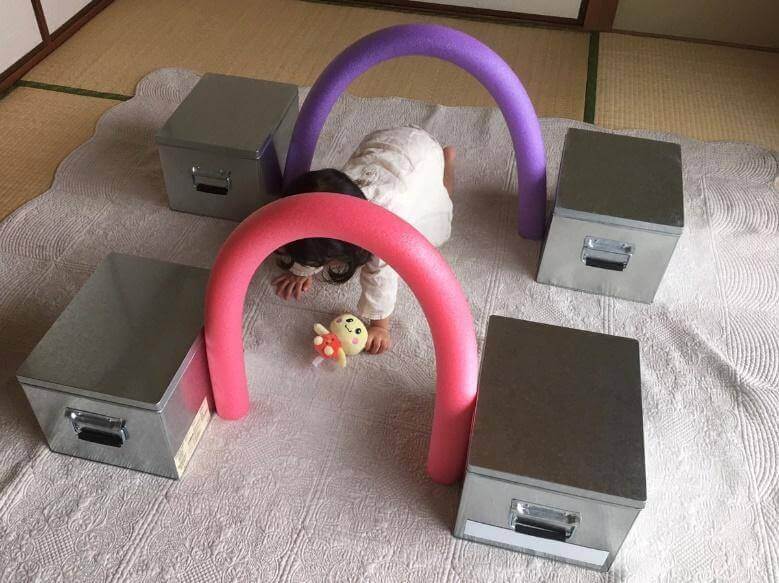 このプールスティックをアーチ状に丸めて重しなどで床に固定すれば、子どもが喜ぶトンネル遊びができちゃいます!アーチの色を変えたりトンネルの幅や次のアーチとの距離を変えたりすると、飽きずに何度も遊べますよ。