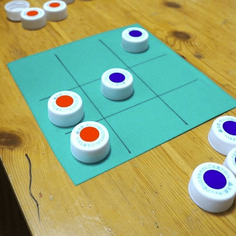 ペットボトルのふたを10個用意し、5個ずつにわけて異なる色の丸シールを貼って駒にします。丸シールは100円ショップで手に入りますよ。そして紙に縦横2本ずつの線を交差するように描いたら準備は完了です。