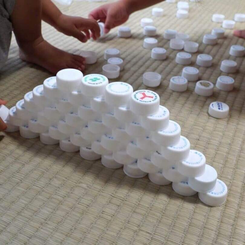 また、ペットボトルのふたが大量にあるという場合は、ふたを高く積む「ピラミッド積み」もおすすめです。単純な作業ですが、適度な難易度で長時間黙々と遊んでくれますよ。