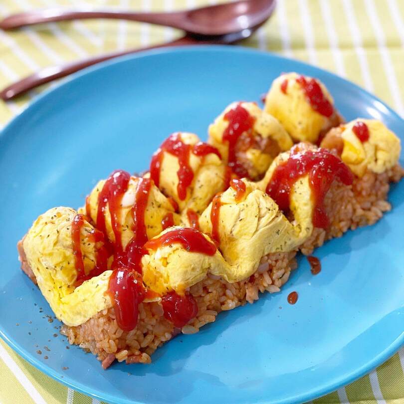 もこっとしたフォルムがとってもキュートな「ひとくちオムライス」。卵を入れて、その上からチキンライスを詰めてひっくり返すだけ!キューブ型に分かれているので、子どもでもスプーンでひと口分ずつ取りやすそうですね。