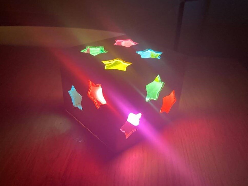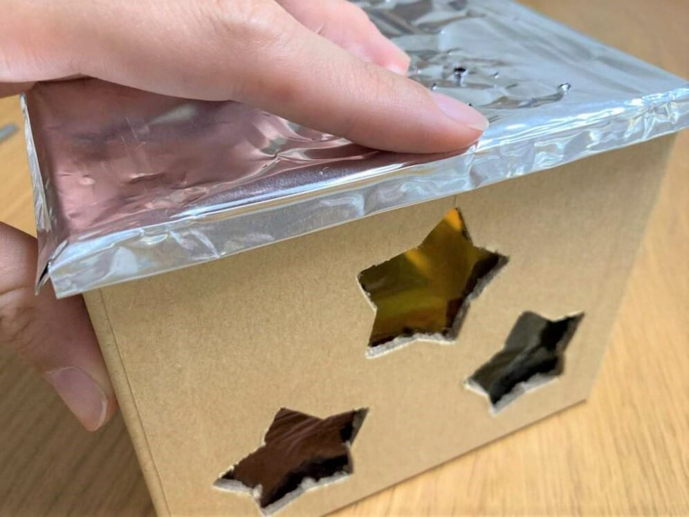 必要な材料は紙製の箱、カラーセロハン、電池式ライトの3つのみ、すべて100均で揃います。紙製の箱に星型のの穴を空け、箱の内側から星型部分にカラーセロハンを貼ります。ライトを置き、箱の底面を上にして被せれば完成です。