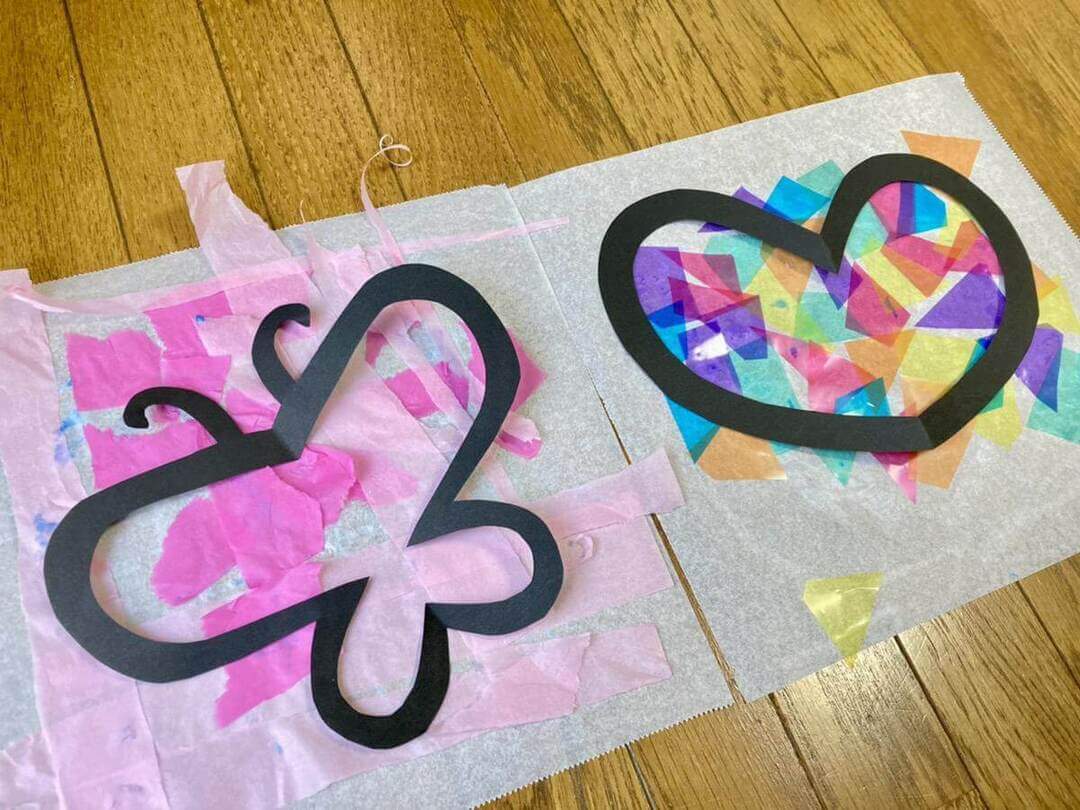 貼り終えたらハートやちょうちょの形に切った黒色の画用紙をクッキングシートの上に置き、位置が決まったらのりで貼ってはさみで周りを切れば完成です。