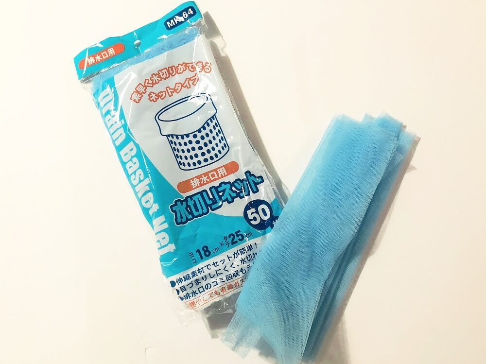 用意するのはこちら、キッチンの排水口などにかぶせて使用する「水切りネット」です。芋類や柑橘系のフルーツなどが入っている野菜ネットでもOK。できるだけ網目が細かいものを選ぶといいですよ。
