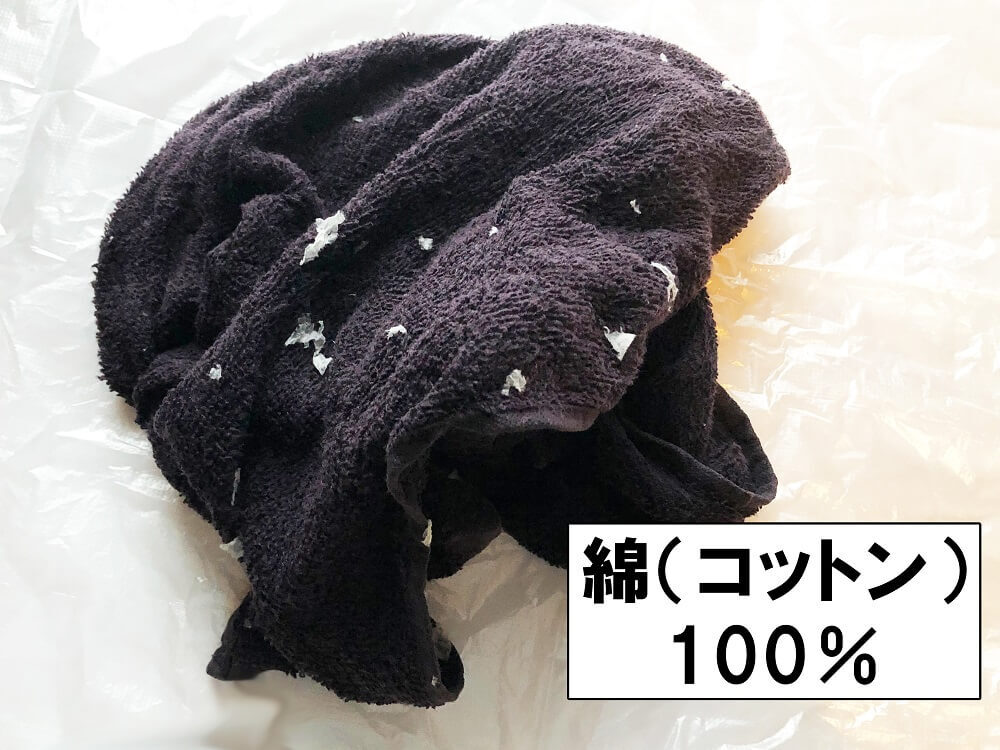 最後に、「コットン生地」のタオルです。パイルにティッシュの繊維が絡まると、なかなか取れないんですよね…。