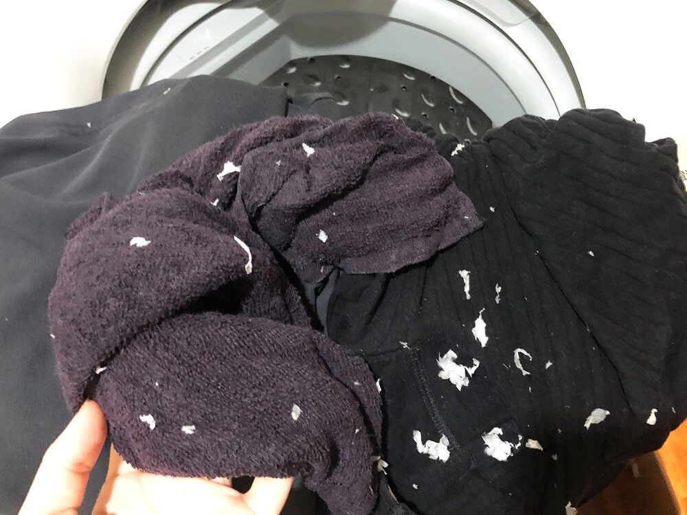 洗濯物に張りついたティッシュを手でひとつひとつ取り除くと、膨大な時間がかかってしまい大変。