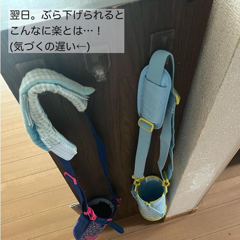 水筒は高さがあるので、収納場所に悩んできたというつのうしさん。そんな悩みを解決したのが、マグネットタイプのtower(山崎実業)のボトルホルダーとダイソーのフック!