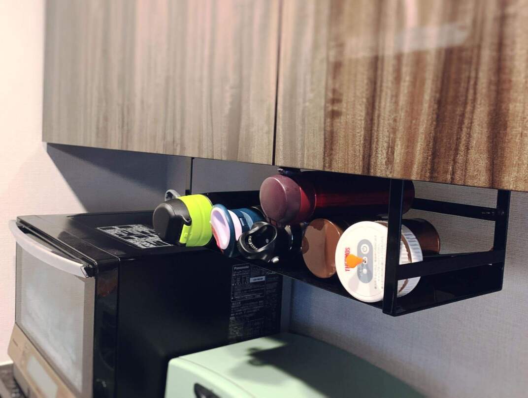 こちらもtowerのアイテムを使った水筒収納。戸棚下ワイドジャグボトル収納ラックを使って、水筒のための収納スペースを設置。かなりの本数の水筒を置くことができるうえ、食器類を収納している吊戸棚の下、電子レンジやトースターの上はデッドスペースになりがちなので、有効活用できますね。