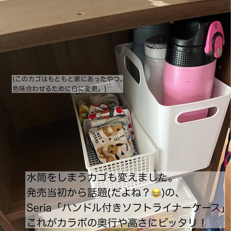 水筒は、セリアの「ハンドル付きソフトライナーケース」に立てて収納。カラーボックスの奥行きや高さにピッタリで、水筒が倒れる心配もなくなりました。