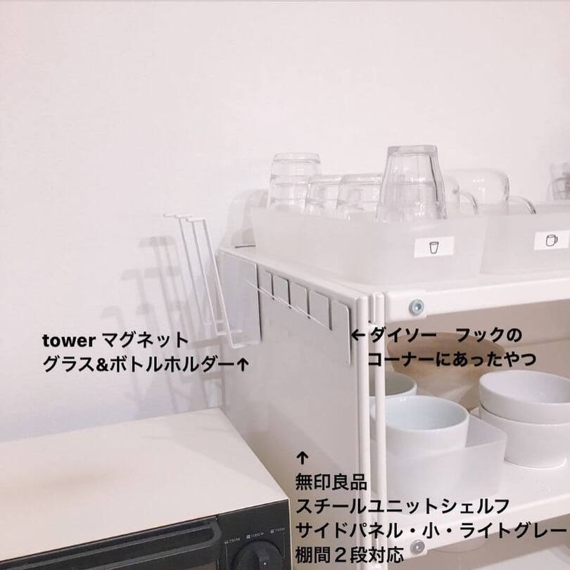 無印良品のユニットシェルフにサイドパネルを取り付けてマグネットがつくようにし、ボトルホルダーに水筒本体、フックにふたをかけられるようにしました。キッチンの死角を活用した、絶妙な収納です!