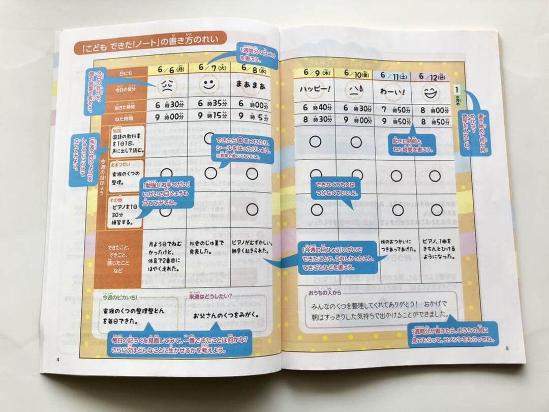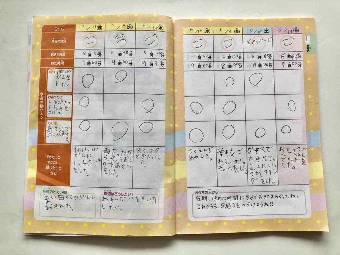 見開きで1週間分を書くことができ、「今週の目ひょう」を達成できたかを〇✕で記入するほか、「今日の気分」を顔や言葉で表すことで気分を客観視できたり、「おきた時間」「ねた時間」を書いてもらうことで規則正しい生活ができているのかを知ることもできます。