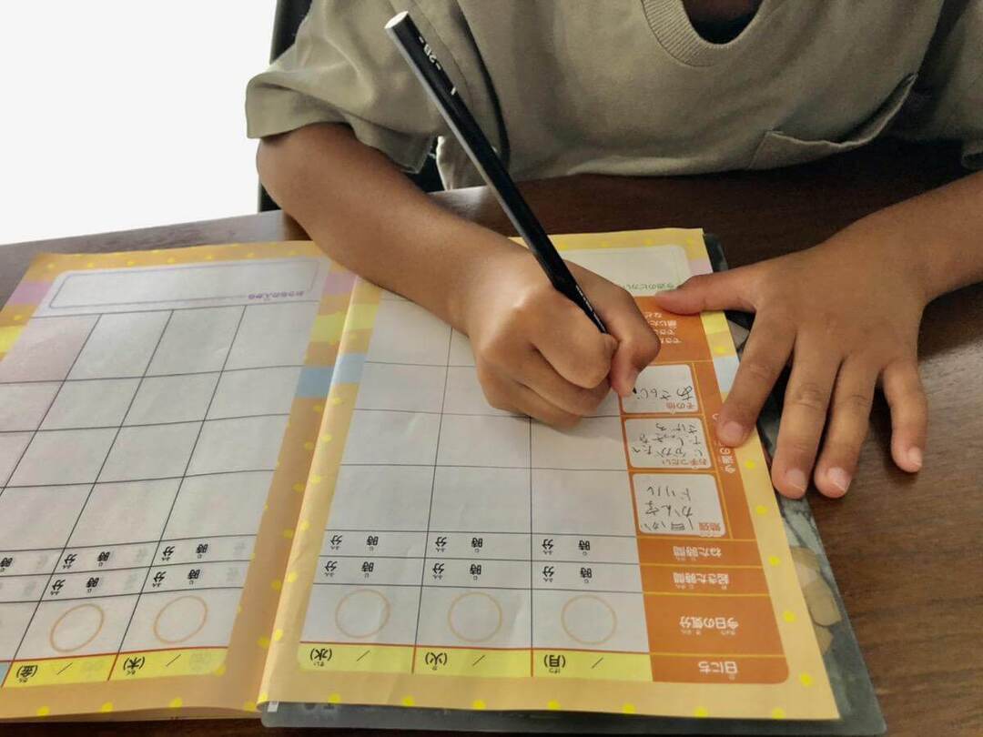 1日の終わりに毎日欠かさず記入する息子。その日のできごとを思い出しながら、いろいろと話してくれるように!コミュニケーションを密に取れるようになったのが、母としては1番うれしいメリットでした。