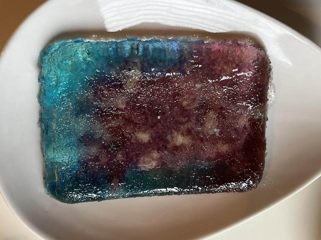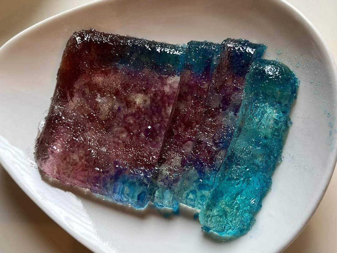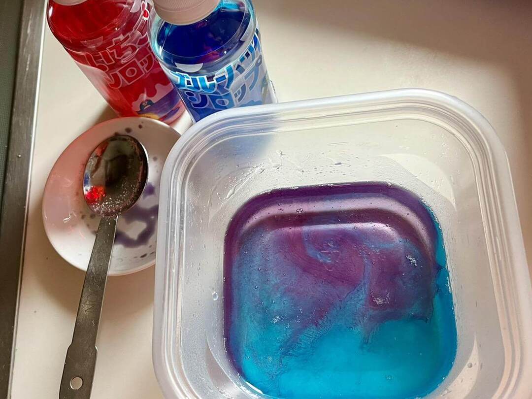 今回はかき氷のいちごシロップとブルーハワイの2色を使って、青と紫のグラデーションカラーにしてみました!