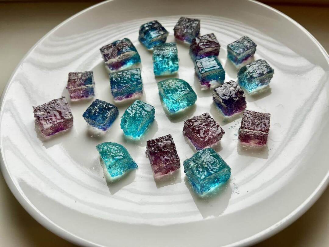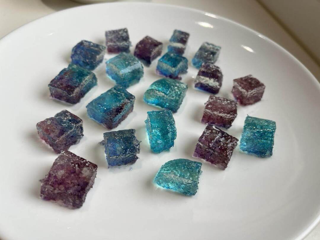 いろいろな形に切ったりちぎったりして、宝石のようにできる琥珀糖。小粒の均一なキューブ型に切り分けると早く乾くそうです!また、切った断面が多いほうが、たくさん光が入ってきれいだと思います♪