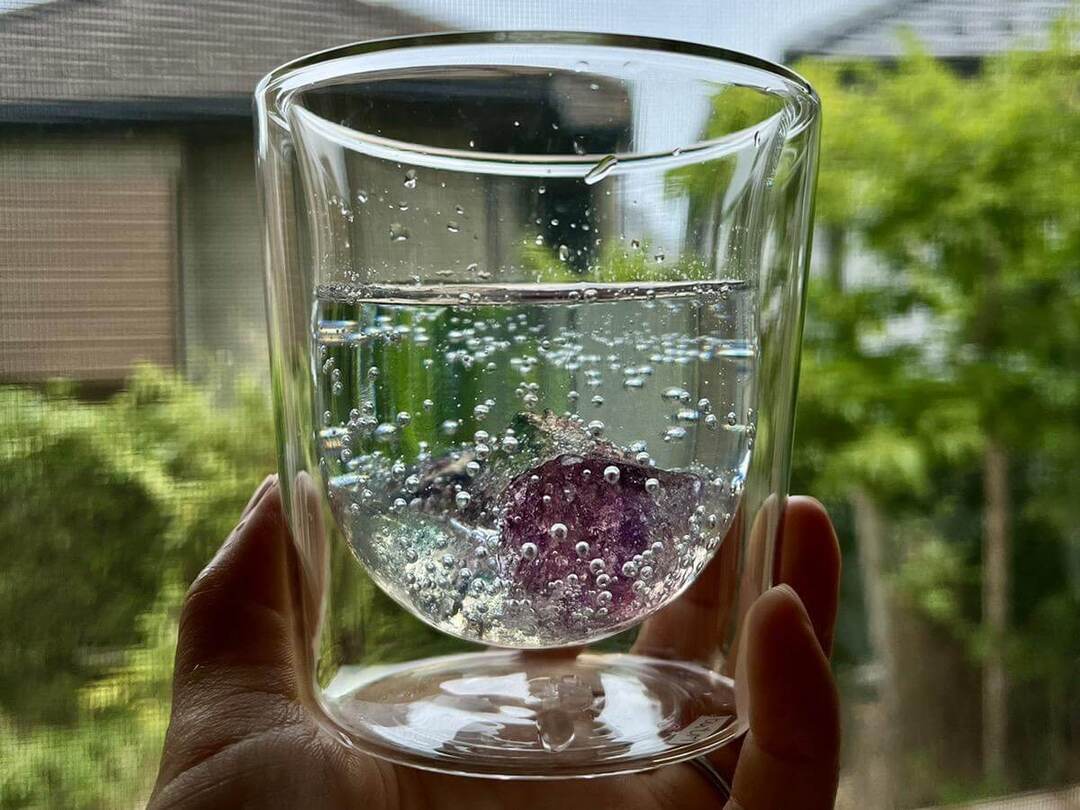 コップに琥珀糖を数粒入れてサイダーを注ぐと、琥珀糖トニックウォーターのできあがり♪見た目も涼やかで、暑い日の休憩タイムのお供にぴったり。