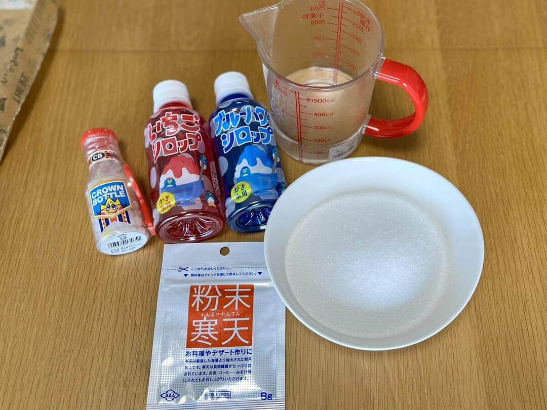かき氷シロップはブルーハワイといちごを用意しました。いずれも100均で手に入りますよ。
