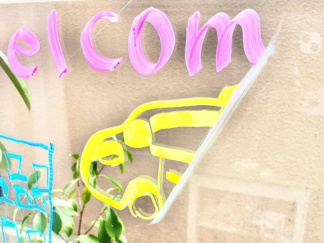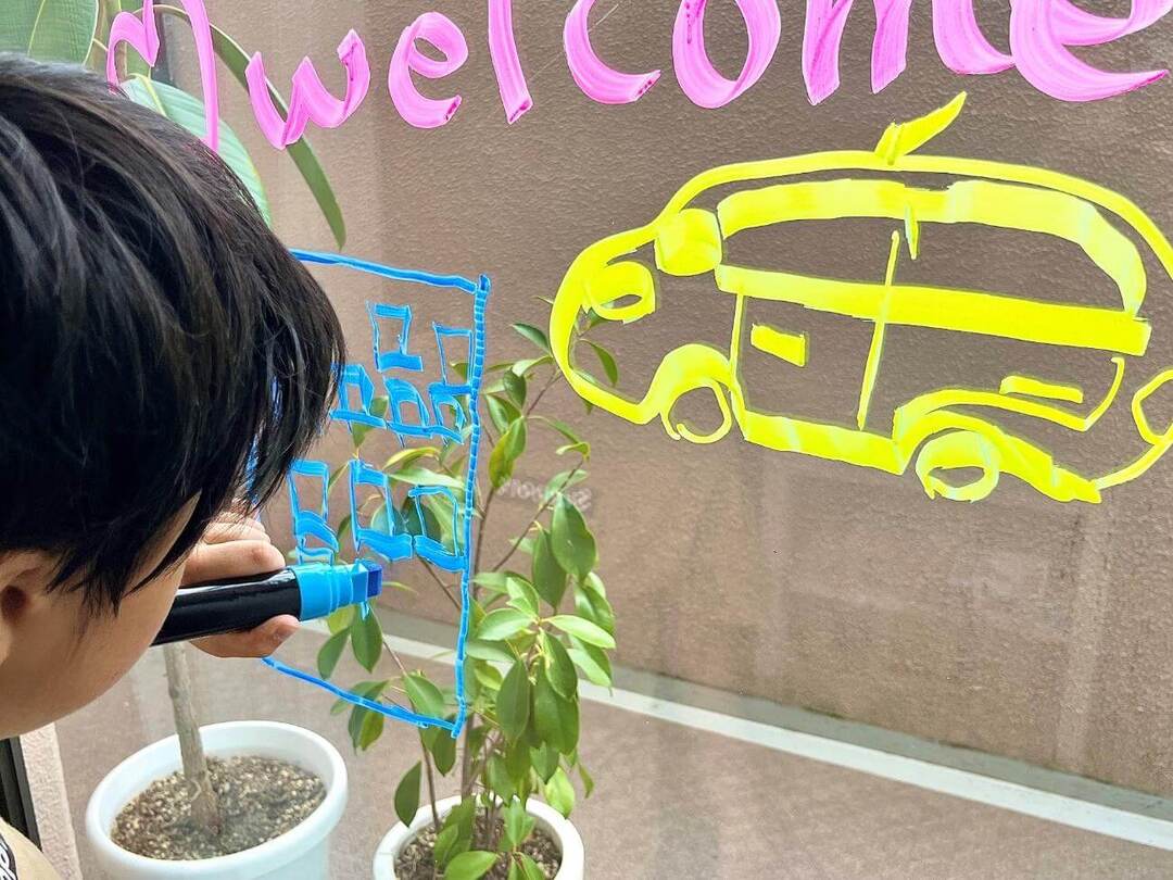 子どもにペンを渡すと、「本当にいいの!?」と言いながらも、さっそく窓に絵を描いていきます。スラスラ~ッとインクが出るので、とっても描きやすい様子。