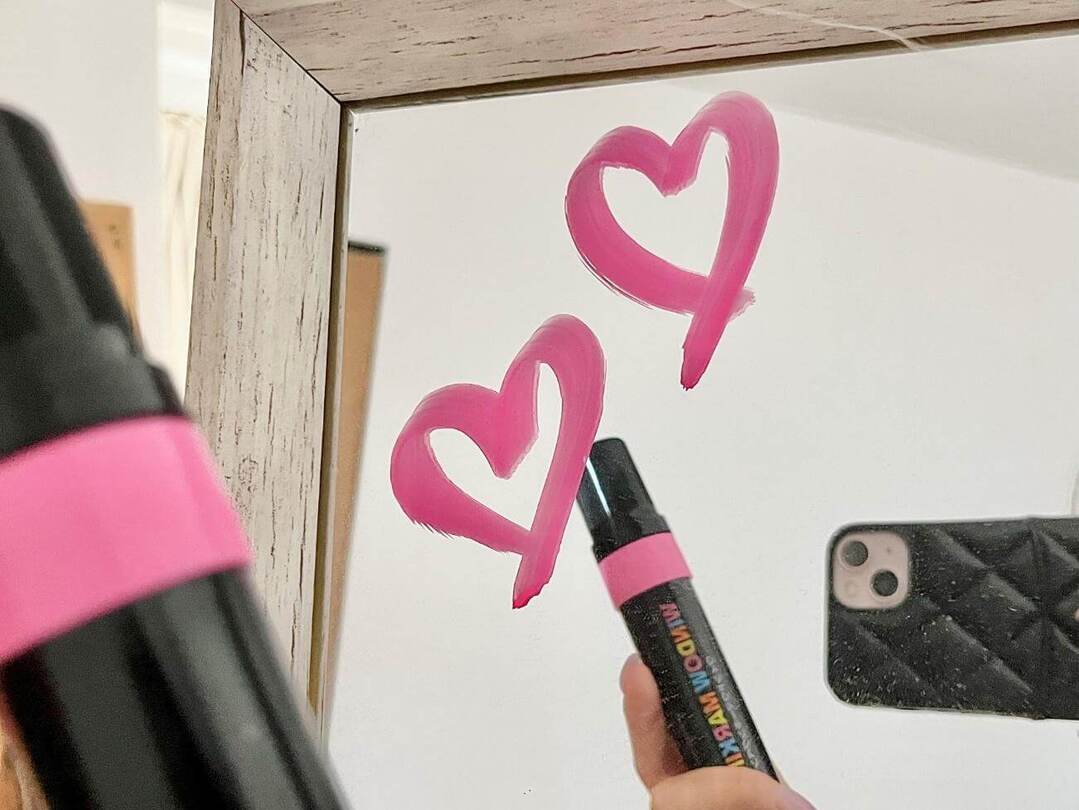 窓やガラス面・ミラーなどに描いても、ティッシュでふき取ればスッと消すことができます。