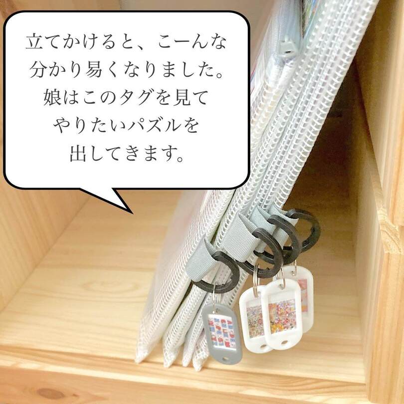 立てかけたときに、どのパズルか一目でわかるようネームタグをつけるという工夫も。この収納方法に変えてから、お子さんが自分で取り出すようになったのはもちろん、お片付けもひとりでできるようになったそうですよ。