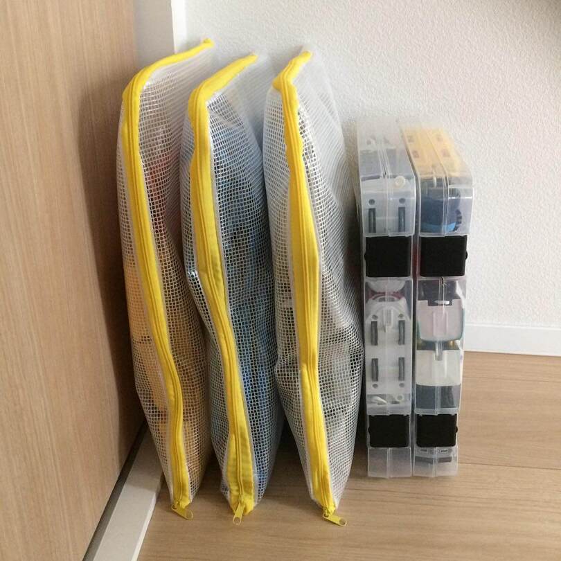 そんなビニールネットケース、片付けにくいおもちゃや、かさばりがちな紙物、小物など子育て家庭のあれこれを収納するのにぴったりなんです!