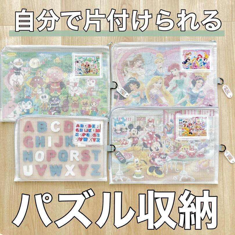 バラバラになりやすく収納に困るパズル。Koroさんは、ダイソーのL型ソフトビニールケースに紙製・木製パズルを収納!L字ファスナーは子どもでも取り出しやすく、フックにかけて収納も可能、立てても崩れにくいとメリットだらけ!