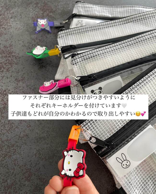 また、注目すべきはファスナー部分!見分けやすいよう、それぞれ違うデザインのキーホルダーをつけているんだそう。これはすぐにでもマネしたいアイデア!