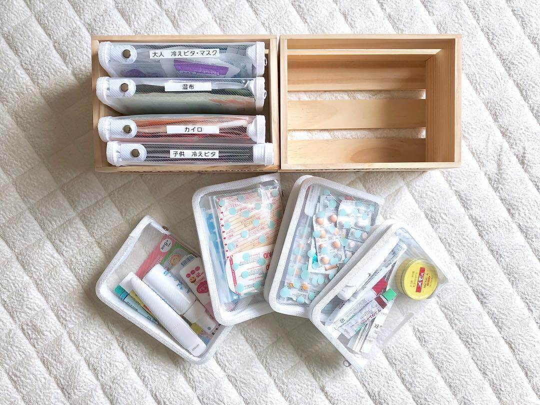 飲み薬や湿布など、“もしも”に備えてストックしておきたい薬や救急グッズは、箱から出してセリアのA6サイズファスナーケースに収納することでこんなにコンパクトに!なんと、収容していたスクエアボックスが2箱空いたそう。