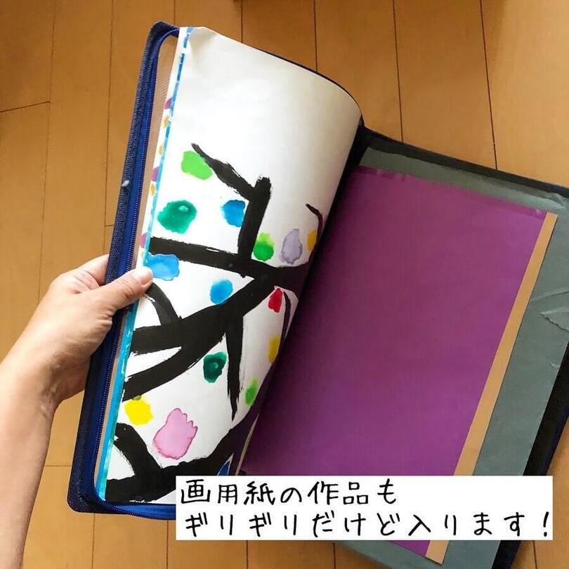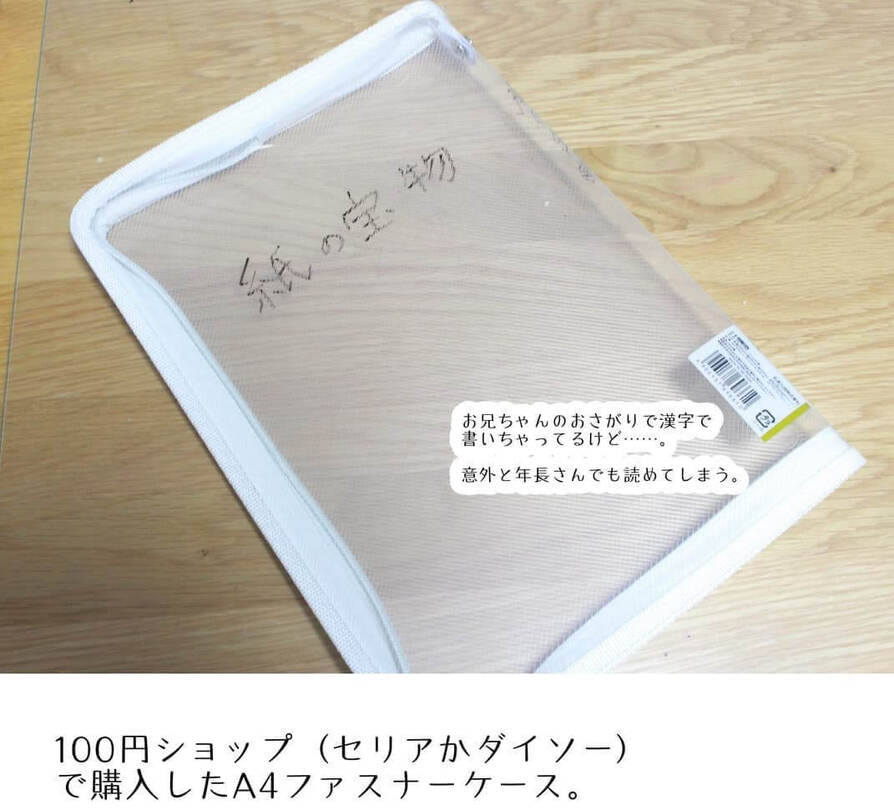 3人のお子さんを持つasamiさんは、子どもの作品を制作した学年ごとに分けてダイソーの「シンプルジッパーファイルB4」に収納しています。水に強い素材なので、きちんとケースにいれておけば万が一水をこぼしても被害を最小限に押さえられますね。