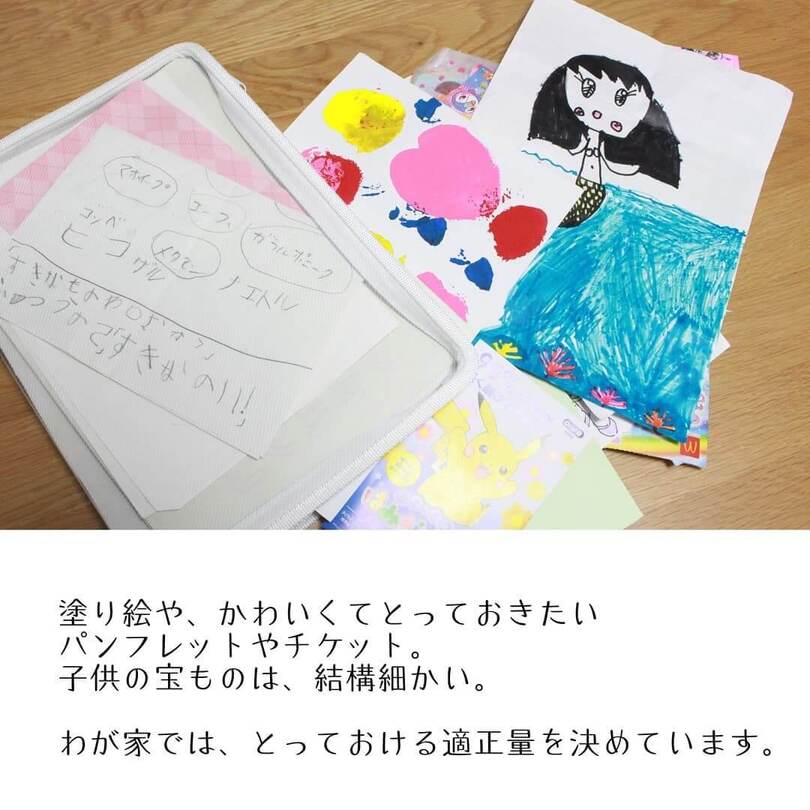 ケース内がパンパンになってきたら、おやこで取っておくもの・破棄するものを相談!なかなか捨てられず、どんどん溜まっていく子どもの作品を定期的に見直せるナイスなアイデアです。