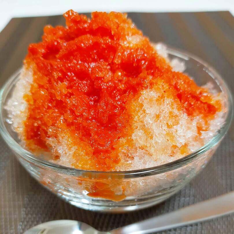 上の写真は野菜ジュースのかき氷。甘すぎない濃縮タイプでとろみのある、味が濃い目の野菜ジュースをかけたところ、 甘くないのでさっぱりどんどん食べられます。