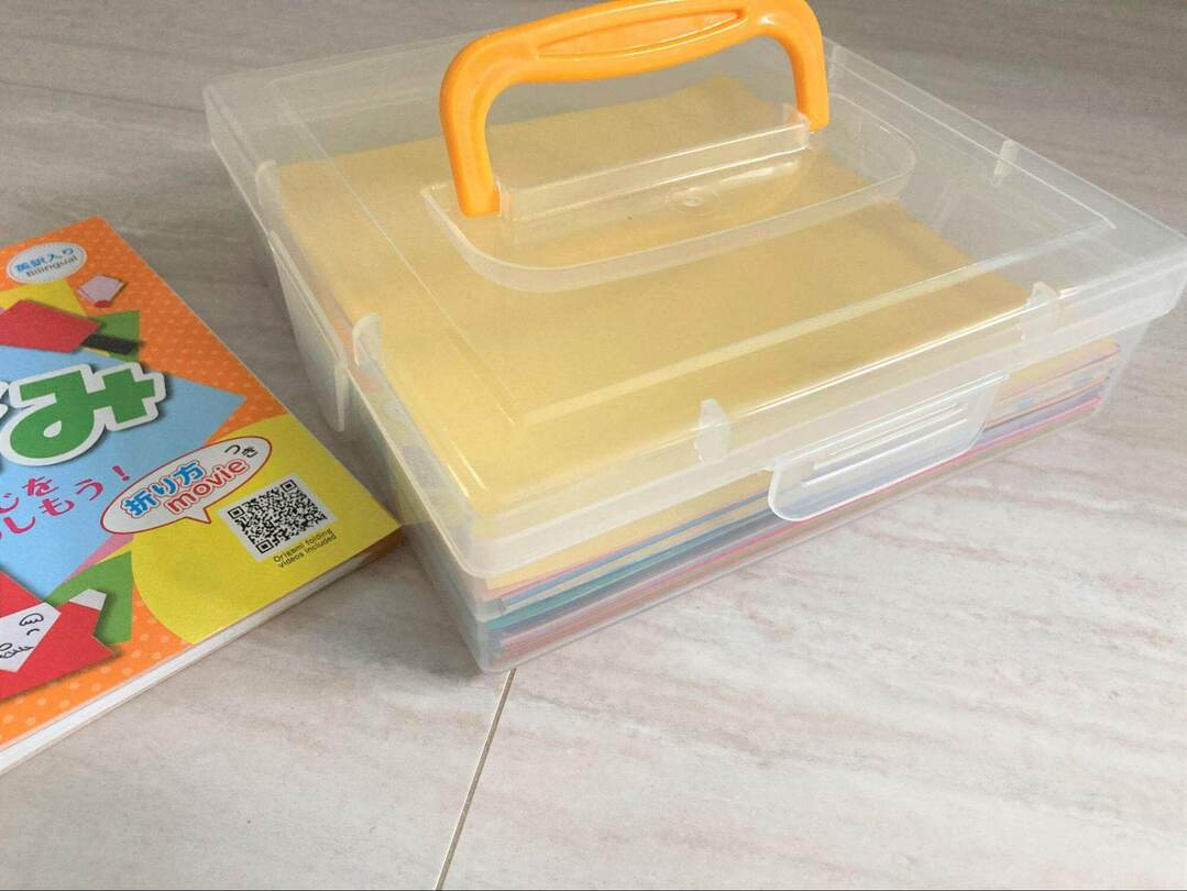 折り紙がそのまま入るのはもちろん、持ち手がついているので家の中での移動やお出かけにも便利です。