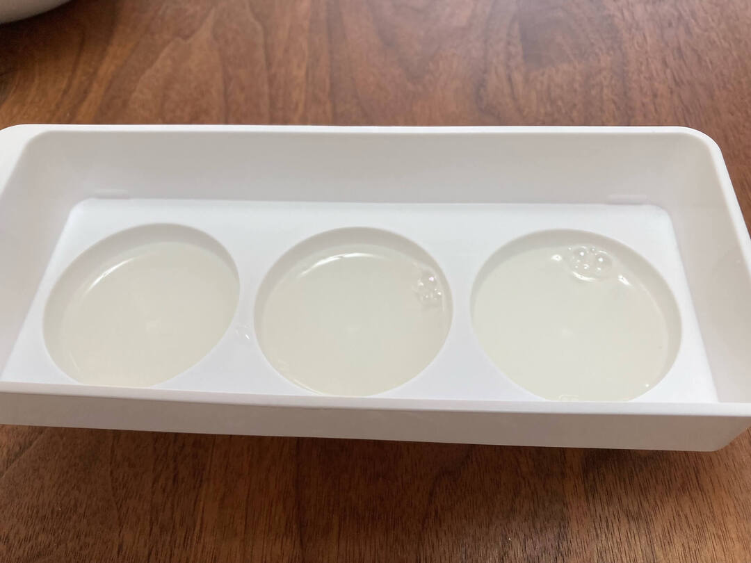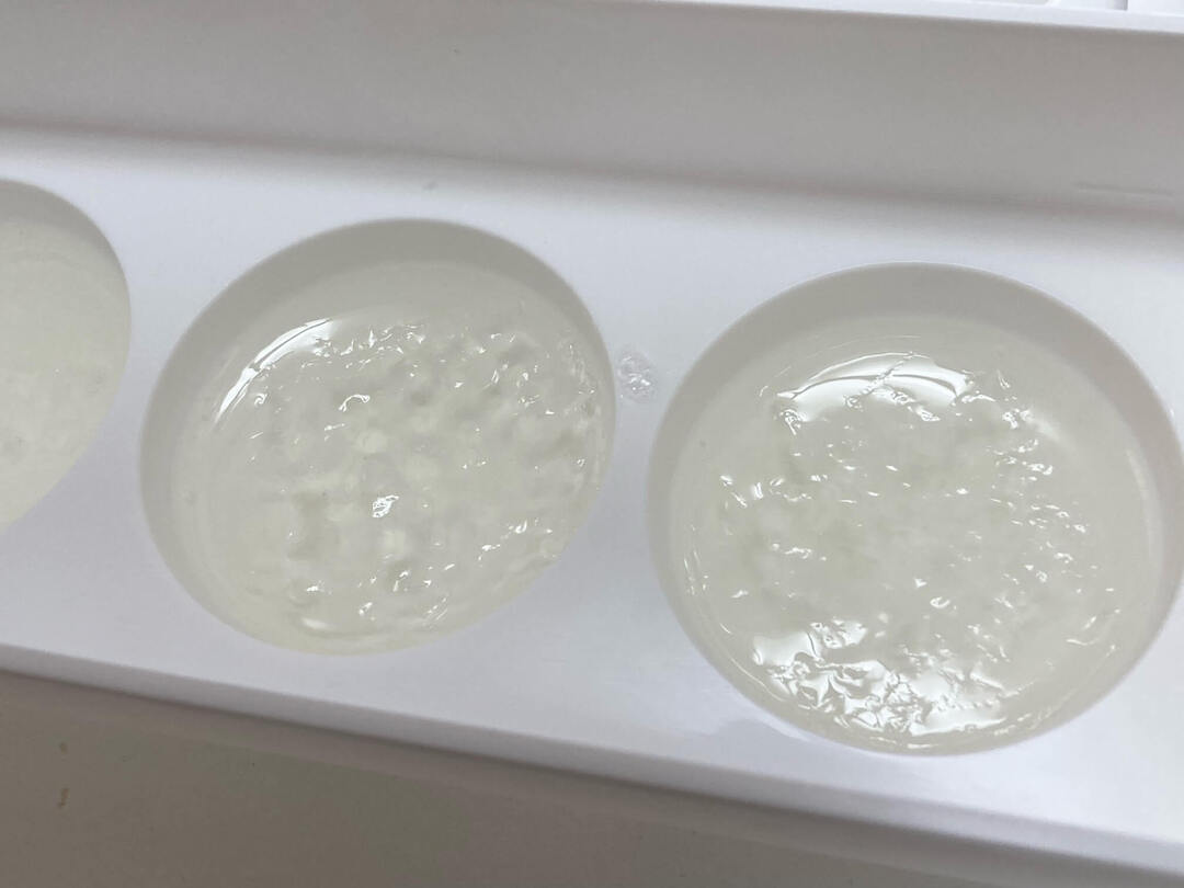 残りのゼラチンをフレーバーウォーターに加えて混ぜ、下の型に大さじ2ずつ入れます。