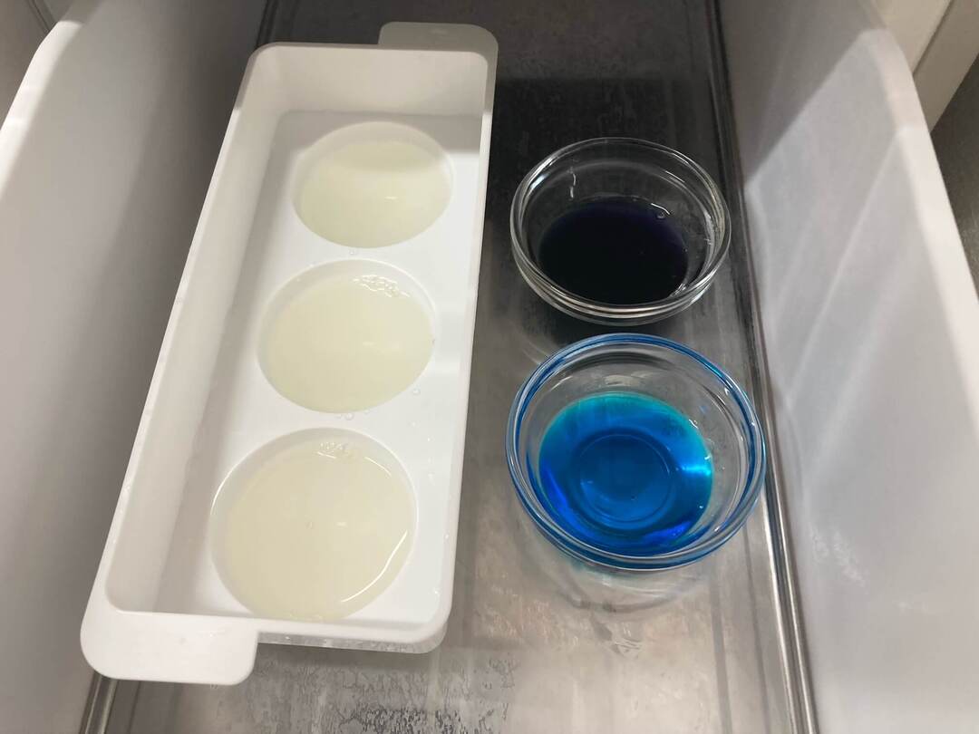 型に入れたゼリー液と2種類のシロップを冷凍室に入れて5分ほど冷やします。