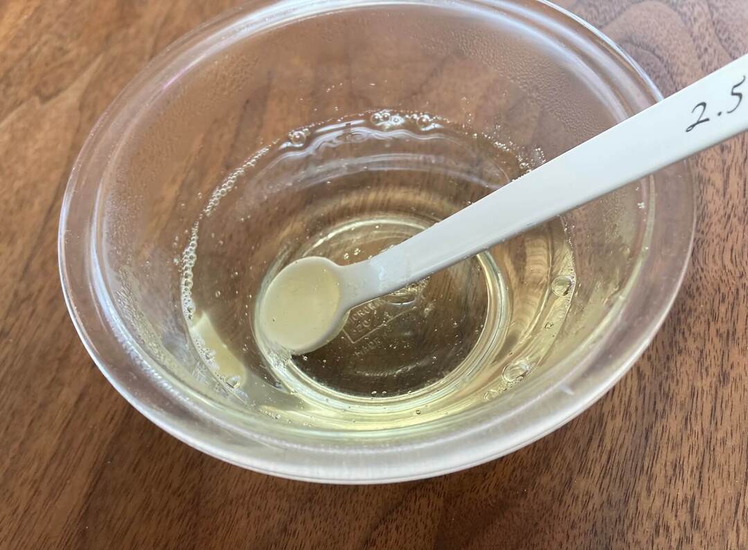 湯(80℃以上)にゼラチンを振り入れて、しっかり混ぜて溶かします。