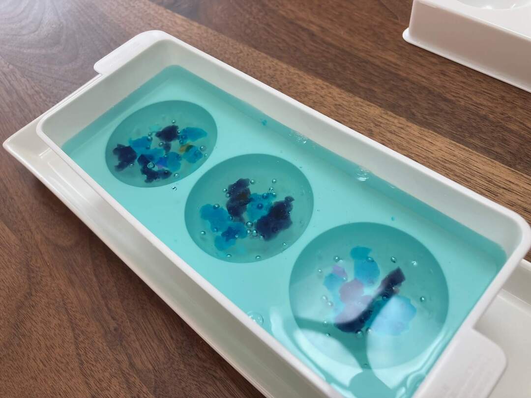 最後に、残しておいた薄いブルーのゼリー液をゆっくり全て注いで、そっとふたをします。ふたに押し出されて上の穴や縁から液があふれ出るので、バットなどの上で作業してくださいね。