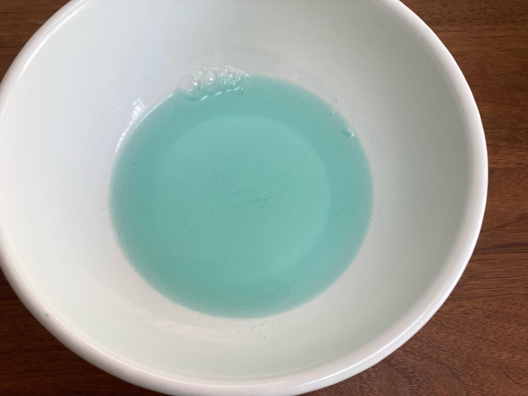 残った液にかき氷シロップ(青)を小さじ1混ぜて、薄いブルーにしておきます。こちらは最後に流し込む分なので取っておきます。