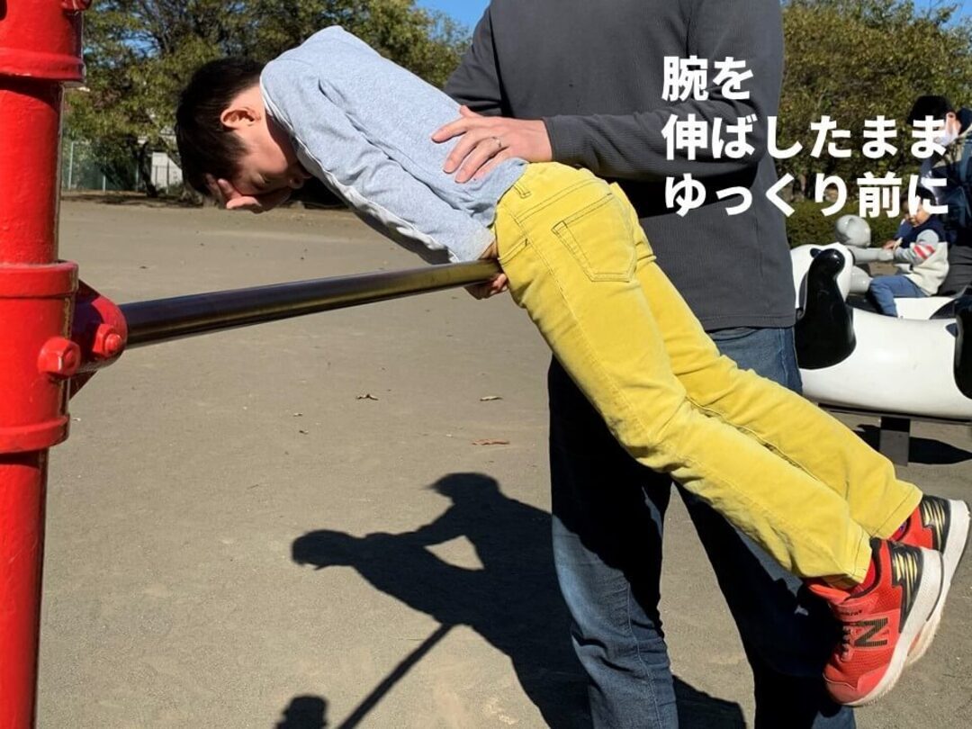 そのまま、上半身をゆっくり前に倒していくのですが、子どもによっては、怖がって固まってしまう場合もあるかもしれません。