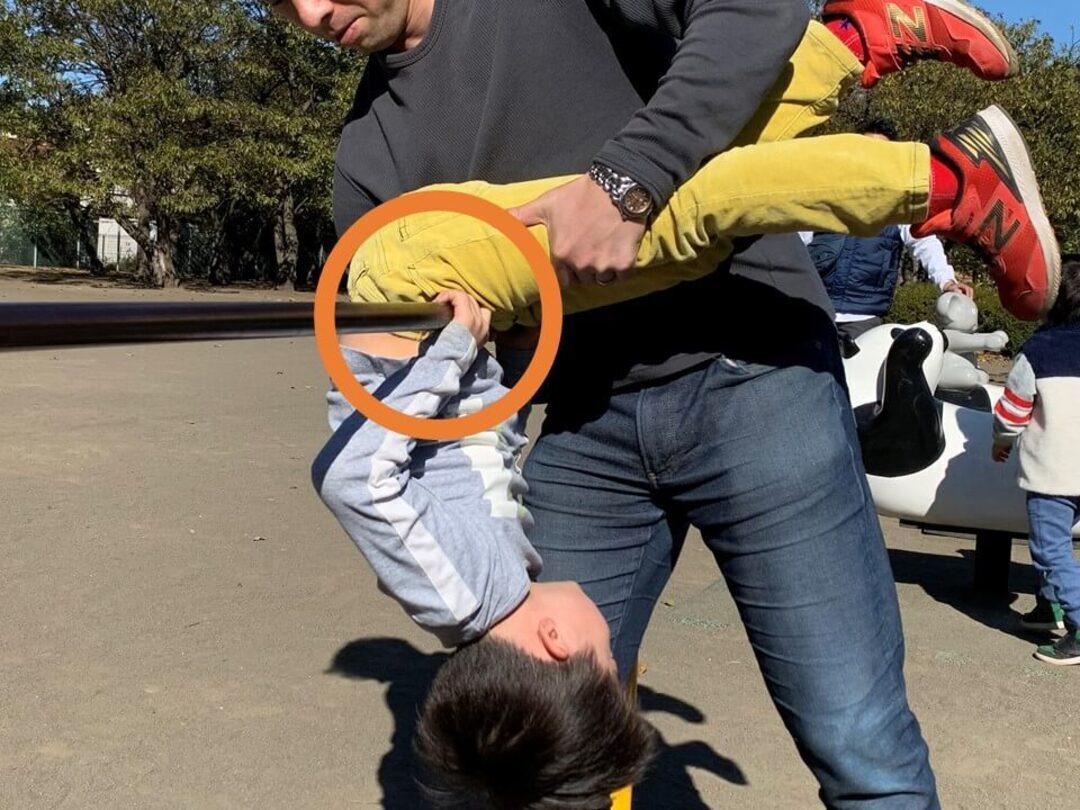 鉄棒の高さは、子どもの腰の位置にあると理想的なのですが、そんなに低い鉄棒はないので、台などを使って調整してあげてください。大人がしゃがんで、太ももの上に乗せてもいいですね。